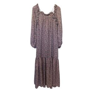 Printed silk maxi dress in Red Keepsake. Features unique laced shoulders, blouson sleeves with elastic cuffs, and shirred skirt. Bust measures 24 1/2“ armpit to armpit laying flat, length is 55“ from shoulder to hem. Excellent condition with no stains or flaws.