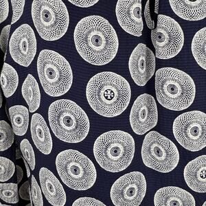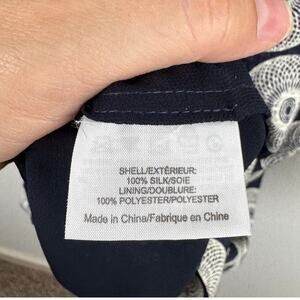 Navy blue with cream medallion prints, 100% silk, flowy fit, keyhole back with button closure at neck, long sleeves with button cuffs, lined, size 4.