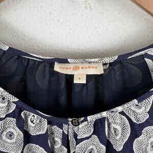 Navy blue with cream medallion prints, 100% silk, flowy fit, keyhole back with button closure at neck, long sleeves with button cuffs, lined, size 4.