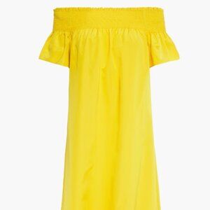 This NWOT Tory Burch dress is the ultimate embodiment of effortless elegance and vibrant charm. With its off-the-shoulder neckline and delicate ruffle accents, it exudes a playful yet sophisticated allure. The A-line silhouette beautifully flatters the figure, while the bright yellow hue adds an instant burst of sunshine to your wardrobe. Crafted from luxurious silk, this midi dress offers a breezy, light feel, making it perfect for warm summer days, as well as the transitional seasons of fall and spring. The short off-the-shoulder sleeves and pullover closure lend it a relaxed, yet undeniably chic vibe, ideal for everything from festive parties to casual outings. Designed for a size medium, this dress captures Tory Burch's signature blend of refined luxury and modern flair, effortlessly elevating your style with a dash of joy and sophistication. Whether you're strolling through sunny streets or attending an afternoon event, this fluttery, feminine piece is sure to turn heads and make every moment feel extraordinary.