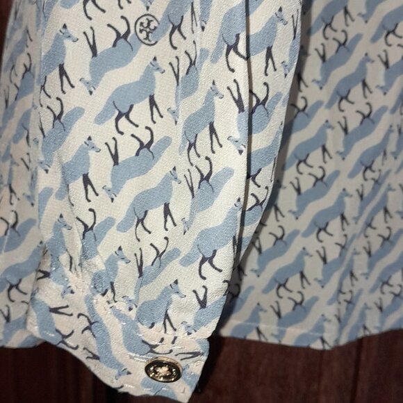 Tory Burch Cream and Steel Blue Silk Top Gently Loved. Beautiful golden buttons and hidden fox with logo throughout design. Approx. Measurements: Top of collar to middle bottom of blouse 29", underarm to underarm 22" (44"chest), sleeve 26.5"