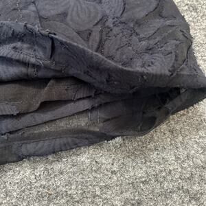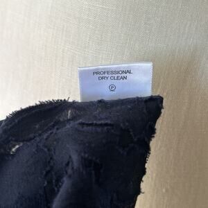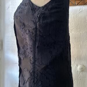 Beautiful silk Tory Burch tank top made of semi sheer black silk, with navy blue tonal floral appliqué detailing. Closes with a side zipper. The bottom hem is loose at a few spots, as seen on the last photo.
