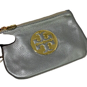 Tory Burch leather zipper pouch / wristlet. This example is a neutral dark silvery gray metallic pebbled leather exterior with a logo print fabric interior. Gold tone metal hardware includes zipper & zipper pulls, front logo medallion and the detachable chain wrist strap. This pouch has in interior zipper pocket and plenty of room for your essentials. Great go-with-everything color - easy to carry and small enough to tuck into a larger bag if you like. Gently used - no flaws - so cute!