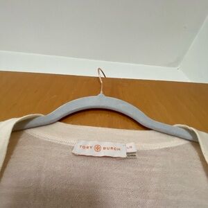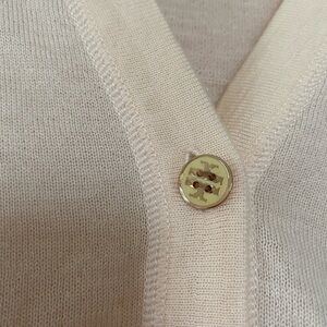 Cream color; 100% “light weight” merino wool; TB logo buttons; about 23” length