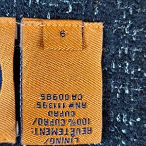 This black 3/4 sleeve blazer is the definition of classic dressing. The black material has silver metallic threads running though out. The collar tops a set of 5 black and silver logo buttons going down the front. The same buttons are used on the two decorative side straps. The 3/4 sleeves have the same decorative button at the cuff. Pairs easily with trousers, skirts, dresses or jeans.