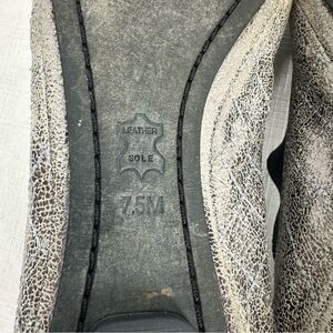 Tory Burch Size 7.5 Navy Blue and Distressed Silver Leather Flats in good preowned condition. Some wear to leather on bottom side by soles, wear to footed wear to soles some wrinkling of elastic around top.