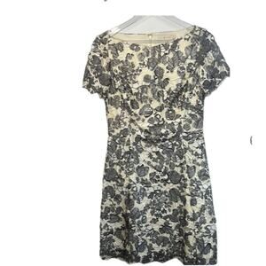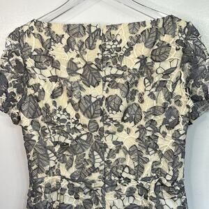 Stunning Tory Burch short-sleeve lace dress, perfect for weddings, cocktail parties, and elegant dinners. Exquisite, fitted silhouette with a delicate silvery leaf goipure lace pattern over a cream-colored soft cotton lining with some spandex for stretch.