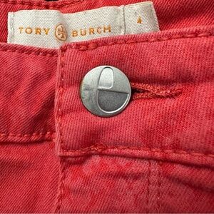 Tory Burch Skinny Pants Orange With Subtle Design SZ 4 Designer 1% Lycra Casual Is In Good Preowned Condition.