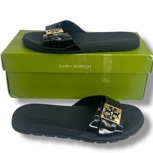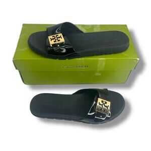Tory Burch Slip on Buckle slide Size 9 Black Gold Flat Sandals Patent PU Logo