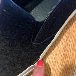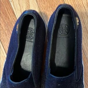 Tory Burch slip on sneakers. Navy blue and deep green worn once the rubber on the sides on both shoes has one tiny spot where it’s coming off but you can’t tell unless you pull it.