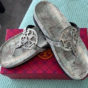 Stylish Tory Burch sandals with a snakeskin pattern. Features black, blue and cream tones. Perfect for casual wear. These like all my shoes are almost new. Cleaning closest! These shoes ran small so if you’re an 8 then 8.5 is perfect