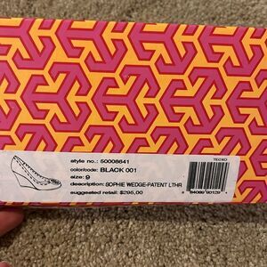 Tory Burch Sophie wedge black patent leather with gold monogram sz 9