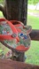 Women's wedge flip flop in orange multicolor tropical print. Melon orange upper with gold brand medallion logo. The size has worn off. They measure like a size 6 with room or size 6.5 to fill the entire footbed. Can be compared to the measurement of a similar shoe that fits well to be certain.