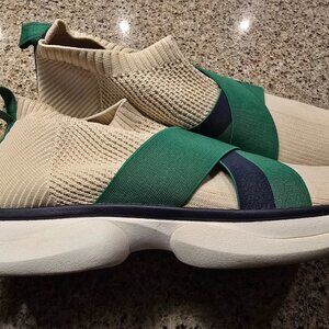 • Modern sneaker with stretchy blue and green straps. Suede heel liner. Padded insole. Rubber tread sole. No box or dustbag.