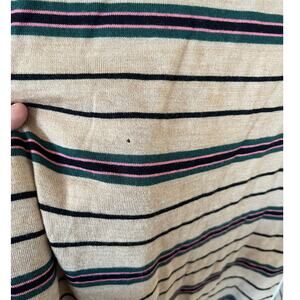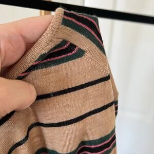 Brown striped knit (100% Merino wool). Sweater. Long sleeves. Crew neckline. 24" from shoulder to hemline. Imported.