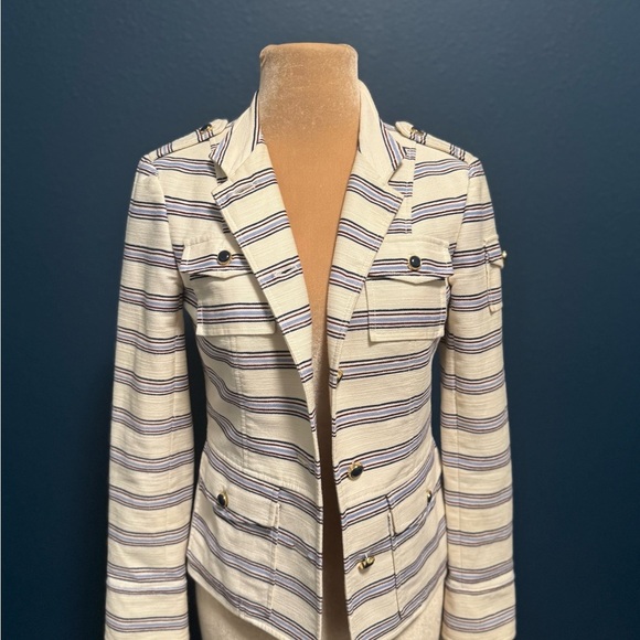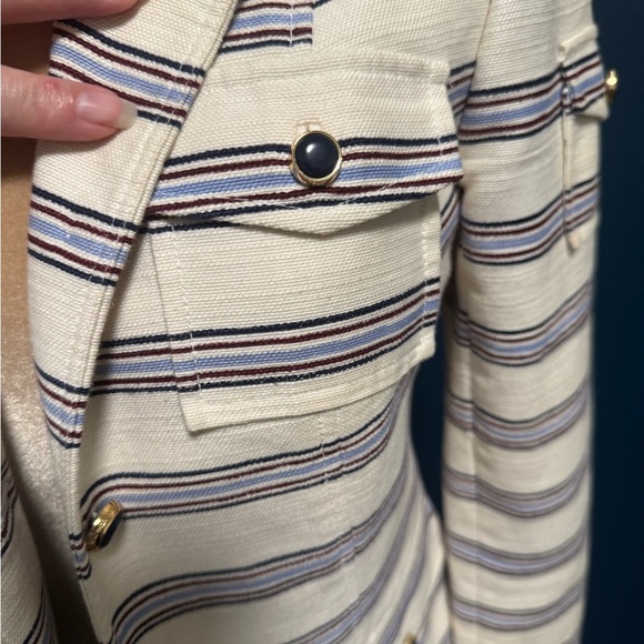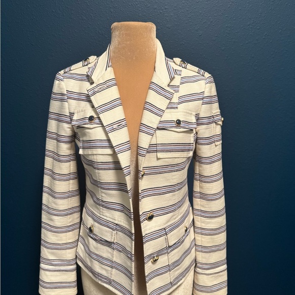 Elevate your style with this chic striped women's jacket. Featuring a classic design with a modern twist, this jacket is perfect for any occasion. The elegant white and blue stripes add a touch of sophistication to your wardrobe.