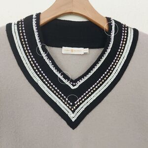 Tory Burch Sweater Womens XS Beige Merino Wool Rhinestones Sequin V-Neck Grandma