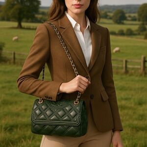 This bag is made of olive green quilted soft genuine leather
