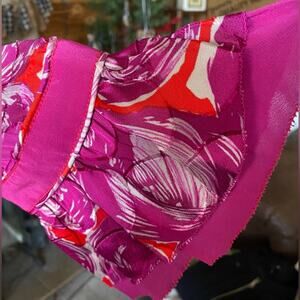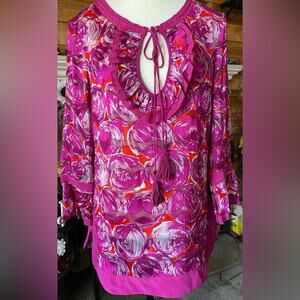 Tory Burch Gwenna Keyhole Tie Oval Ruffle Floral. Front has oval ruffle with tie closure Deep Pink Print is absolutely stunning!! Sleeve has a band across and two tiered ruffle. Pit to pit 19” Chest size 38” Shoulder to bottom 27” Sleeve 19” 55% Rayon 45% Silk Size is 4