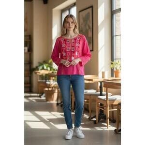 Elevate your wardrobe with this charming Tory Burch tunic top! Perfect for adding a touch of bohemian flair to any outfit. The beautiful pink hue is complemented by intricate embroidery, shimmering sequins, and playful tassel accents. This top is sure to brighten your day!
