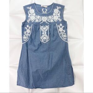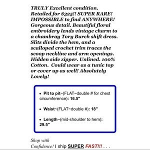 TRULY Excellent condition. Retailed for 325!! SUPER RARE! IMPOSSIBLE to find ANYWHERE! Gorgeous detail. Beautiful floral embroidery lends vintage charm to a chambray Tory Burch shift dress. Slits divide the hem, and a scalloped crochet trim traces the scoop neckline and arm openings. Hidden side zipper. Unlined. 100% Cotton. Could wear as a tunic top or cover up as well! Absolutely Lovely!