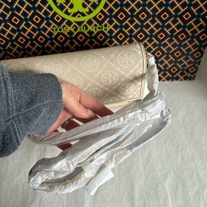 Tory Burch T Monogram Chain Wallet Crossbody Bag Ivory Gold Tan Cream Neutral