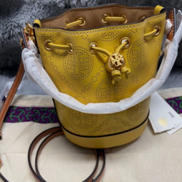 Tory Burch T Monogram Perforated Leather bucket MSRP$488 Statement Piece