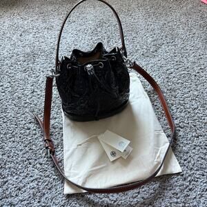 Tory Burch T Monogram Puffy Patent Bucket Bag Black Leather Crossbody Logo