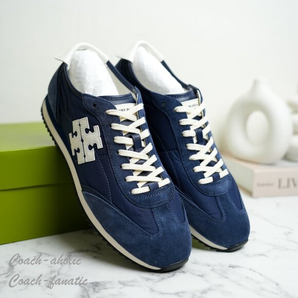 NIB Tory Burch T-Logo Nylon Suede Vintage Sneaker 2.0 in Tory Navy/Blanc