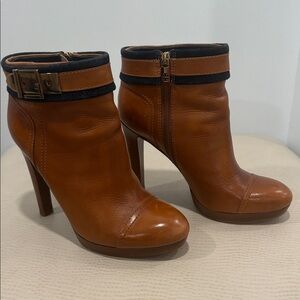 Stylish Tory Burch ankle boots. Tan leather with gold buckle detail. Perfect for any occasion.