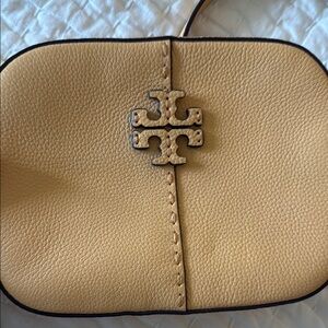 Tory Burch camera bag - yellow. Very gently used. Very slight discoloration on back of bag from rubbing against jeans - have not tried to clean. Inside and other visible areas of bag - no stains or defects.