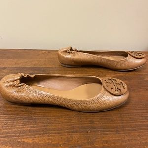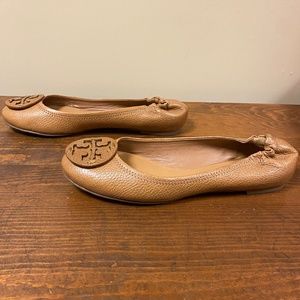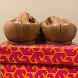 Elegant tan flats with signature Tory Burch logo. Comfortable and stylish design.