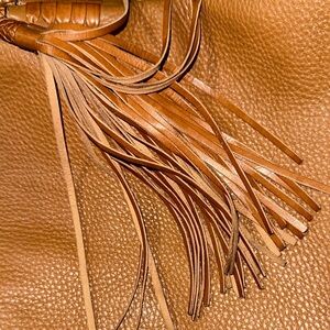 Chic Tory Burch shoulder bag in tan leather. Perfect match for any Fall outfit Features a braided handle for added style.