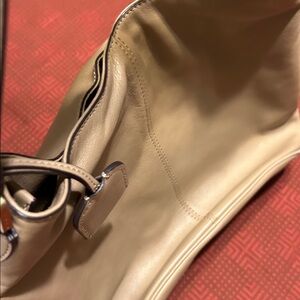 Elegant tan leather bag. Features front pocket with gold clasp. Adjustable shoulder strap. Iconic Tory Burch logo tag.