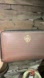 Chic leather wallet in tan. Features gold logo detail. Compact and stylish.