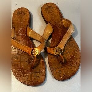 Tory Burch Tan Patent THORA Gold Logo Flip Flop Sandal US 7 M