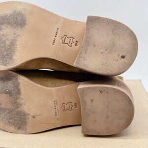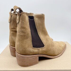 Elegant suede ankle boots. Features a classic tan color. Comfortable block heel. Perfect for versatile styling.