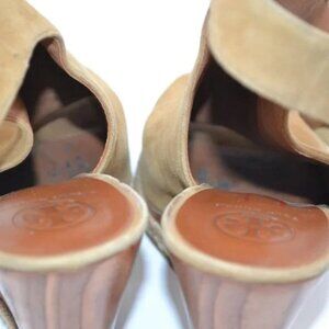 Tory Burch Tan Suede Leather Open Peep Toe Wood Wedge Slingback Heels Sandals 8