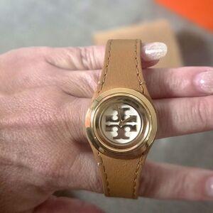 Elegant Tory Burch watches with tan and black leather straps. Gold-tone accents. Iconic logo design. This is an awesome Tory Burch watch set. Face pops out so you can switch between a black or brown band. The brown band has never been worn and the black was only worn a few times. All paper and instructions are included along with 2 new batteries!