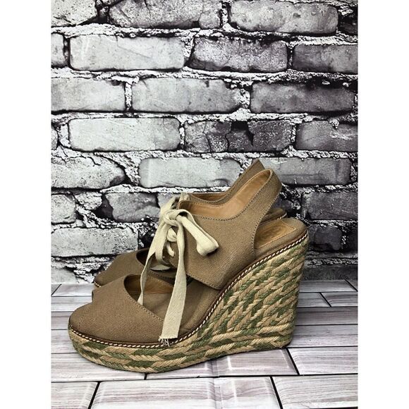 Tory Burch Taupe Canvas Textile Green Tan Espadrilles Wedge Women Sz 10M US/41EU