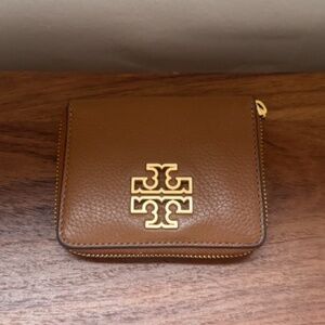 The Tory Burch Thea Bi-fold Pebble leather Wallet in camel color is a stylish and functional accessory for women.