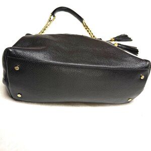 Authentic black tumbled leather (feels like a buttery soft heavier quality leather) ▪️Double Gold Chain over leather straps ▪️ Magnetic Closure ▪️13” W (at clean base)▪️ 9” L ▪️ 2 interior zip pockets ▪️ 2 interior open pouch pockets and two zip closure pocket▪️ Very gently used, and sure to be a favorite....great craftsmanship on this piece.