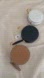 Round black leather coin pouch with gold hardware. Features Tory Burch logo.