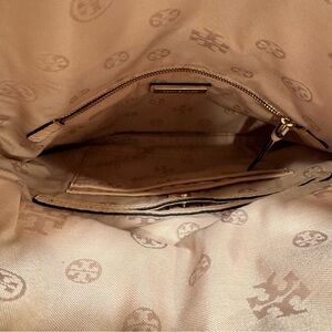 Excellent like new condition. No call outs. Tory Burch blush pink fold over messenger crossbody bag. Adjustable and removable strap, zip close, pebbled leather, embosed Tory logo, tassels, inside zip compartment& slip pockets. Can be worn as a crossbody or clutch. MSRP $370