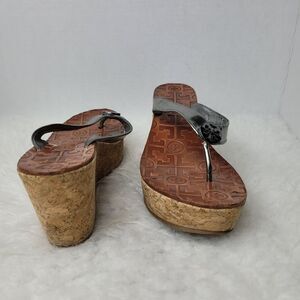 Tory Burch Thora Silver Patent Leather Cork Wedge Sandal Shoes Size 7.5
