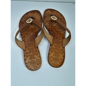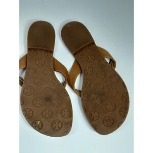 Tory Burch Thora Thong Sandal Flip Flops Tan Leather Gold Logo Sz 6 M