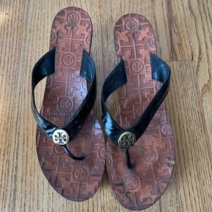 Chic Tory Burch flip-flops with glossy black straps. Tan soles with embossed pattern. Features signature logo emblem.