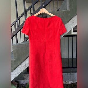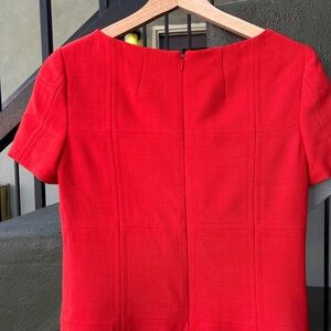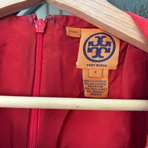 Tory Burch Tomato Red Poly Wool Stretch Shift Career Dress Patchwork Stitching Size 2. This dress is in overall very good pre-owned condition with just some slight discoloration on the inside of the collar (can't be see when worn) and one small spot on the right sleeve please see last photo.