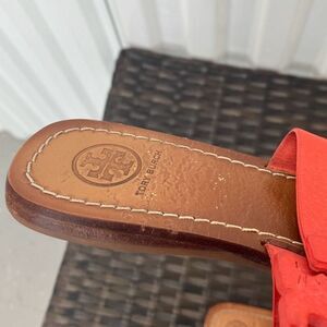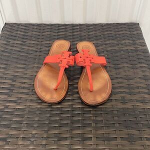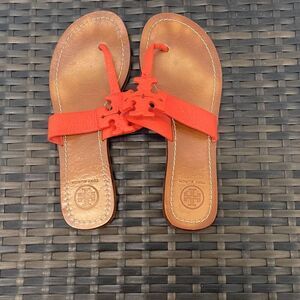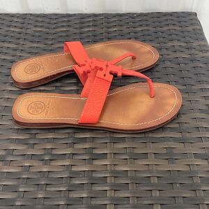 Tory, Burch, tong, poppy, coral sandals, women’s size 8 in good preowned condition normal wear and tear. There’s discoloration to the sole of the shoe see the pictures for where overall in good shape.  the color is a coral orange color more of an orange.