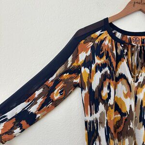 Tory Burch Top Womens XS Orange Navy Multicolor Silk 3/4 Sleeve Keyhole Tunic